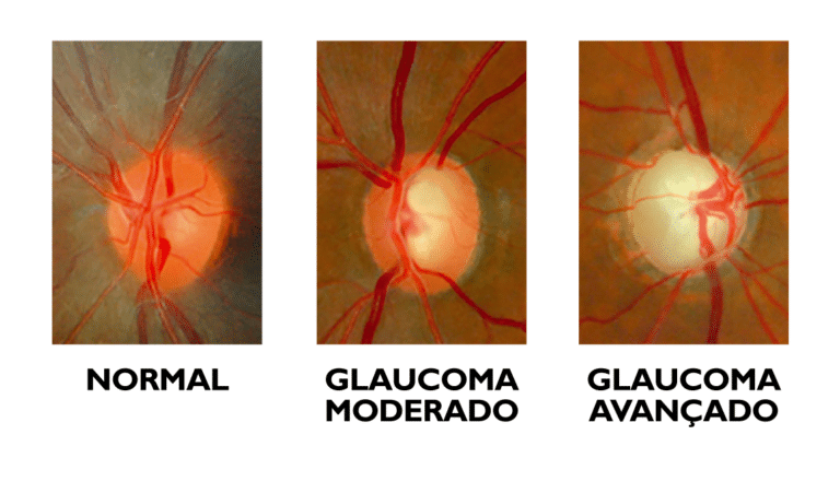 Glaucoma é a doença que lesa as fibras nervosas do nervo óptico, causando um aumento na escavação visualizada no exame de fundo de olho. Geralmente, a doença é associada ao aumento da pressão ocular.